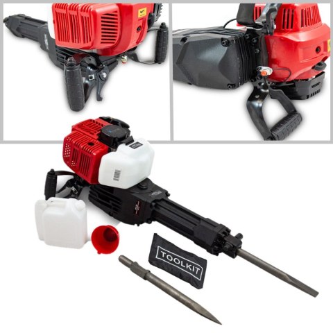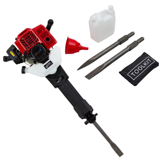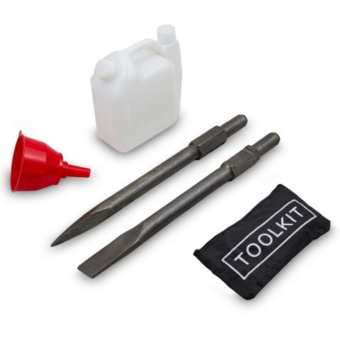 W zestawie 2 dłuta, pojemnik na paliwo i torba.