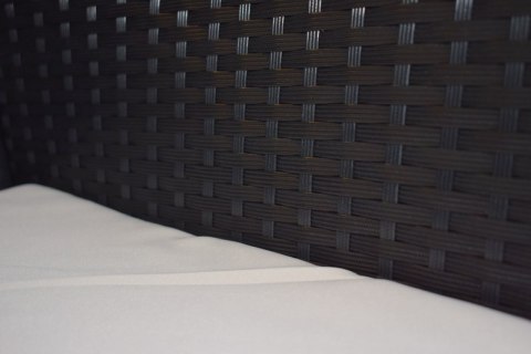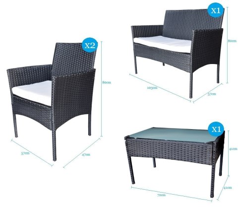 W skład zestawu wchodzi sofa, 2 fotele oraz stolik z hartowanym szkłem. Zestaw cechuje się niezwykłą trwałością i odpornością na warunki atmosferyczne, rattan jest odporny na wilgoć oraz promieniowanie UV - nie blaknie i jest praktycznie niezniszczalny. Mocna metalowa rama mebli jest bardzo stabilna i odporna na korozję. Każde siedzisko posiada wygodne poduszki z wszytym zamkiem błyskawicznym.