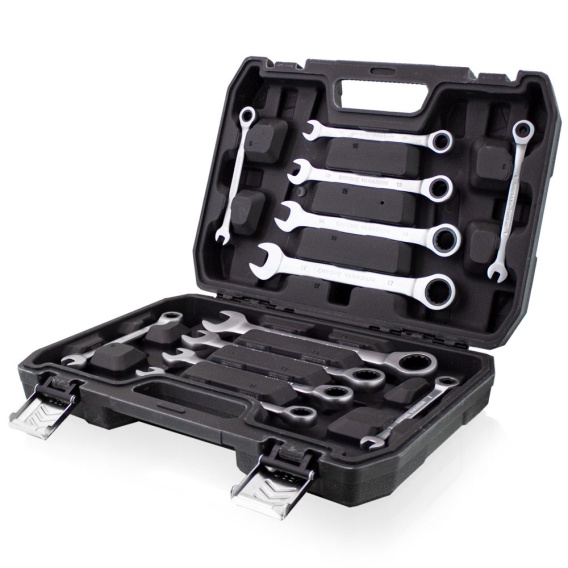 Zestaw zawiera 12 kluczy płasko–oczkowych z grzechotką w najczęściej używanych rozmiarach: